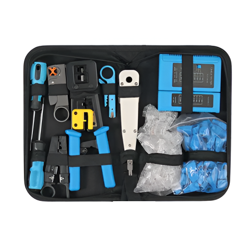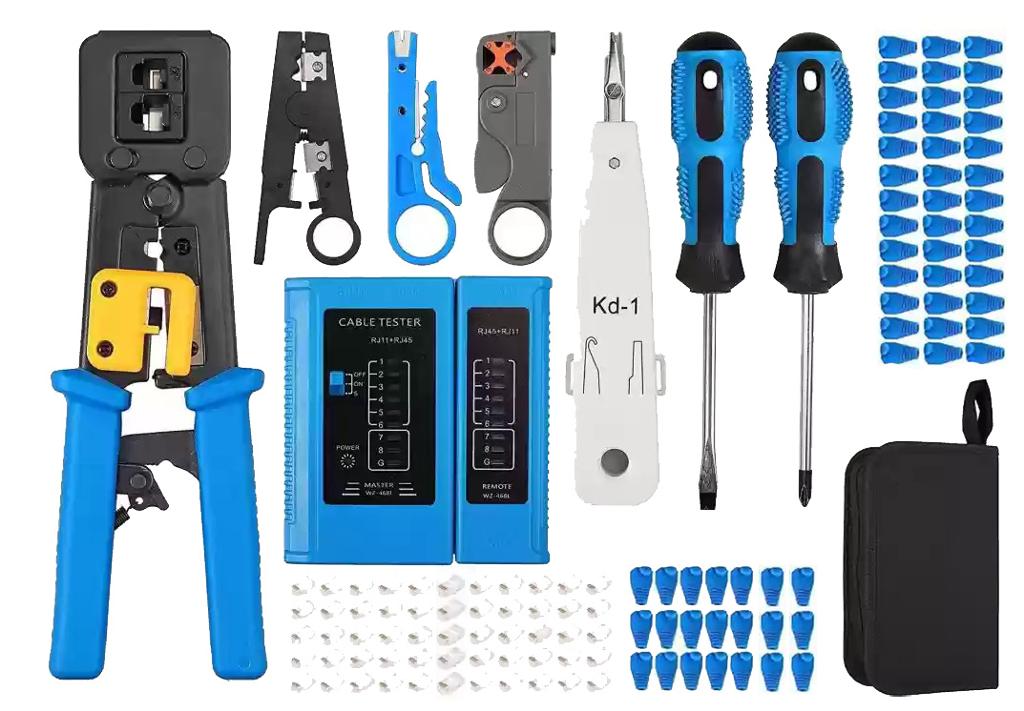 KIT INCLUYE2 destornilladores,3 pelacables,1 ponchadoraRJ45,1ponchadora de impacto,100 conectores,100 bota protectora,1 tester de cable de Red